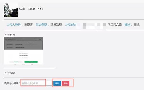 點(diǎn)擊圖文展示字段:微信頭像、昵稱、身份、自治類別、服務(wù)地址、服務(wù)時(shí)長、上傳圖片、上傳視頻、電話、積分?jǐn)?shù)、提交時(shí)間、審核時(shí)間
