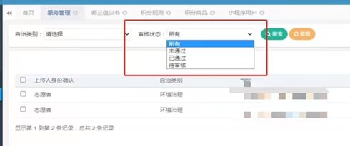 點(diǎn)擊圖文展示字段:微信頭像、昵稱、身份、自治類別、服務(wù)地址、服務(wù)時(shí)長、上傳圖片、上傳視頻、電話、積分?jǐn)?shù)、提交時(shí)間、審核時(shí)間、為通過理由