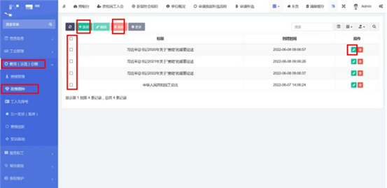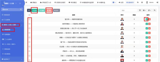 工人先鋒號(hào)中查看已錄入的工人先鋒號(hào)信息。點(diǎn)擊添加按鈕,輸入姓名,上傳照片,選擇級(jí)別,輸入事跡。事跡的內(nèi)容編輯器中支持文字排版、上傳圖片、插入視頻鏈接、插入表格、給文字加超鏈接等功能。點(diǎn)擊確定按鈕保存內(nèi)容,發(fā)布到前端。點(diǎn)擊編輯按鈕,編輯之前發(fā)布的內(nèi)容后點(diǎn)擊確定按鈕保存內(nèi)容,發(fā)布到前端。支持批量刪除,勾選想要?jiǎng)h除的信息,點(diǎn)擊上方按鈕中的刪除按鈕。