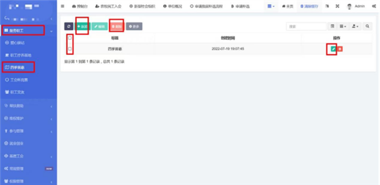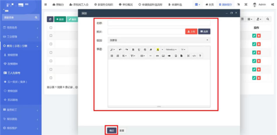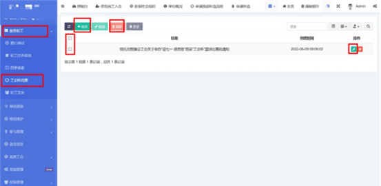 職工交友中查看已錄入的信息。點(diǎn)擊添加按鈕,輸入標(biāo)題和內(nèi)容。內(nèi)容編輯器支持文字排版、上傳圖片、插入視頻鏈接、插入表格、給文字加超鏈接等功能。點(diǎn)擊確定按鈕保存內(nèi)容,發(fā)布到前端。點(diǎn)擊編輯按鈕,編輯之前發(fā)布的內(nèi)容后點(diǎn)擊確定按鈕保存內(nèi)容,發(fā)布到前端。支持批量刪除,勾選想要?jiǎng)h除的信息,點(diǎn)擊上方按鈕中的刪除按鈕。