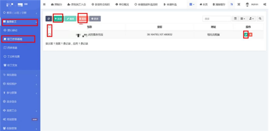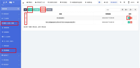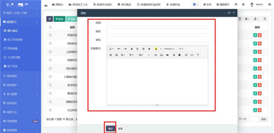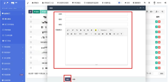 職工療休養(yǎng)基地中查看已錄入的信息。點(diǎn)擊添加按鈕,輸入基地名稱、基地地址、基地坐標(biāo)、基地簡(jiǎn)介。基地簡(jiǎn)介中支持文字排版、上傳圖片、插入視頻鏈接、插入表格、給文字加超鏈接等功能。點(diǎn)擊確定按鈕保存內(nèi)容,發(fā)布到前端。點(diǎn)擊編輯按鈕,編輯之前發(fā)布的內(nèi)容后點(diǎn)擊確定按鈕保存內(nèi)容,發(fā)布到前端。支持批量刪除,勾選想要?jiǎng)h除的信息,點(diǎn)擊上方按鈕中的刪除按鈕。